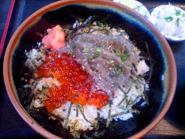 ↑ちょっとピンボケしてるのが哀しい(i-i)。藤浪の「生しらすいくら丼」(1200円)です。釜揚げしらすにするか、生しらすにするか迷ったんだけど、「生しらすはその日の朝とれたやつしか使えない」っていうレアさに惹かれて「生」にしました。写真の通り、生しらす、透き通ってます^^